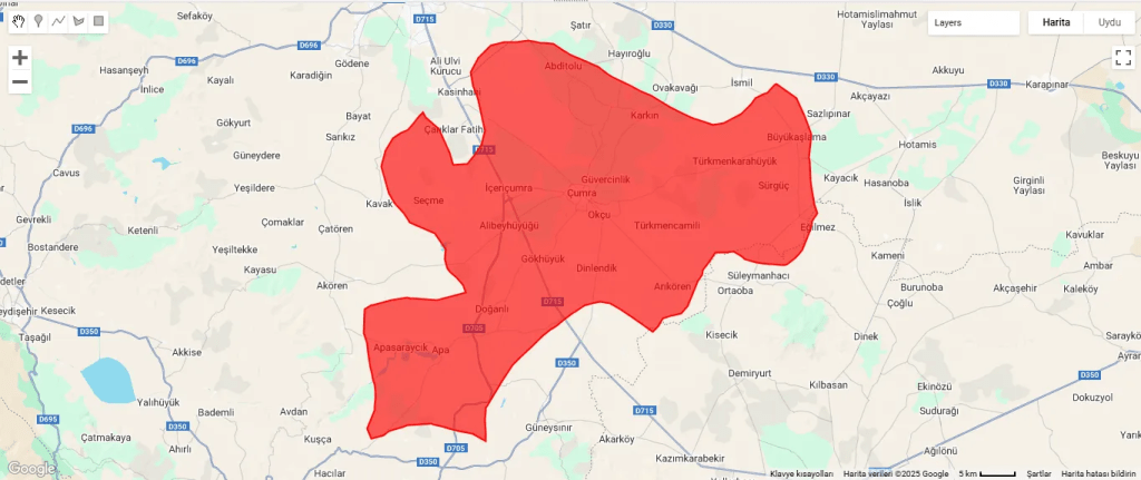 Map.addLayer(cumraGeometry, {color: 'red'}, 'Cumra District Boundary');