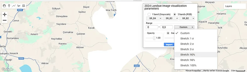 We click on the “Custom” option. There are different “Stretch” alternatives here. For example, the “Stretch: 90%” option leaves out the lowest 5% and the highest 5% of pixel values and displays the remaining values. The same logic applies for other different percentage values.