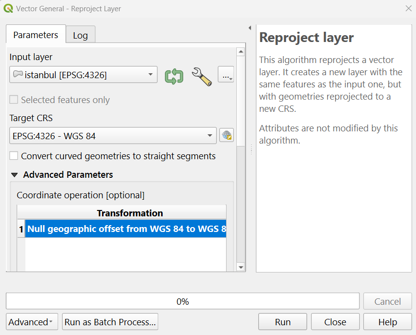 It is possible to change the coordinate system of that data on this window. However, this only redefines how QGIS interprets the layer’s coordinates. Coordinate values do not change so It does not reproject the actual data. To permanently reproject a layer, we need to use Reproject tool